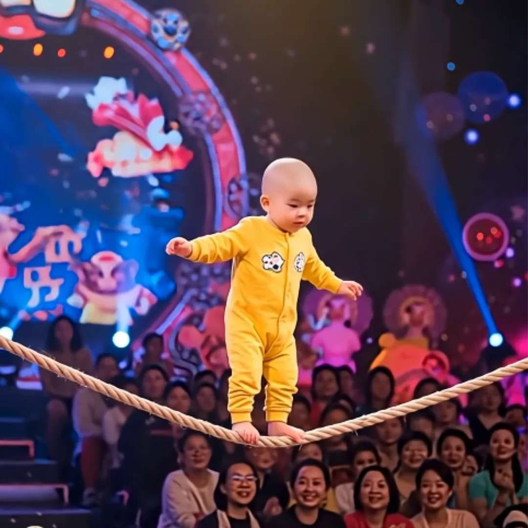 The tightrope was already set. Suspended across the stage, the thin rope stretched taut, gleaming under the stage lights like a challenge whispered to the brave. For an adult performer, such a setup would already induce apprehension.