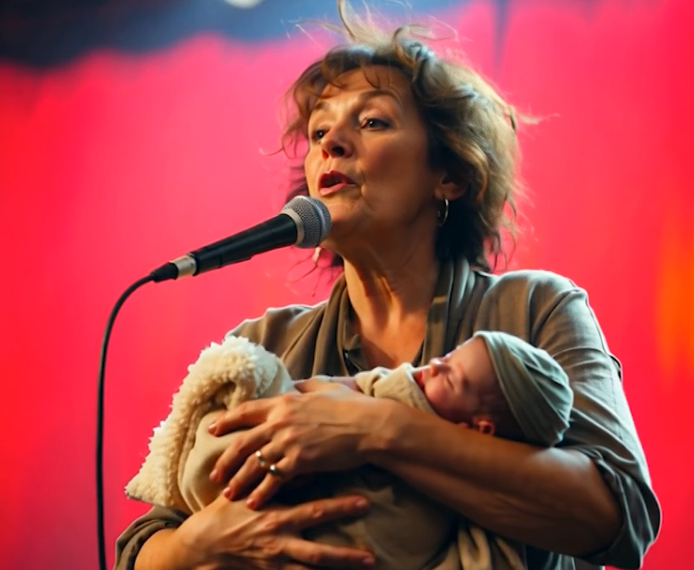 The background blazed red behind her like a sunrise. In her arms was a newborn, wrapped in fleece, head nestled beneath a soft cap. The mic was close, but her attention was closer to the child. And yet—she sang.