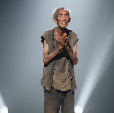 The stage was silent. Only the soft hum of the lights above and the faint murmurs of anticipation filled the grand hall. Then, from the shadows, an elderly man stepped forward — frail, barefoot, and dressed in tattered clothes that whispered of a life far removed from the glamour of the stage.