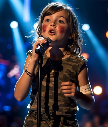 She stood under the lights like a tiny warrior—dressed in camouflage, her cheeks still painted with traces of red, perhaps from struggle, perhaps from life. Her legs were braced, her arms marked with medical tape, yet her spine was straight with quiet defiance. The microphone towered over her, but she didn’t flinch.