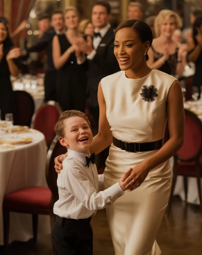 With a sparkle of determination, he twirled slowly with her, lifting his head high. The entire room fell silent. Guests who had moments ago been lost in casual conversations now stood to their feet, clapping in awe. The boy was no longer the shy child sitting in the shadows. He was a dancer, brave and radiant, stealing the spotlight with his courage.
