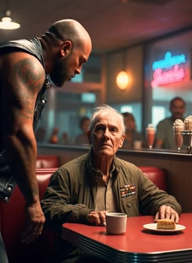 The biker scoffed, ready to swing. But his friends—who until then had watched with amused smirks—suddenly stood and stepped between him and the veteran. One of them, older and clearly the true leader, stared at the tattooed man with cold disappointment.