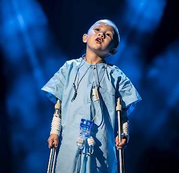 The stage was silent. Blue spotlights glowed like the early morning sky before sunrise. A small figure made her way slowly to the center—supported not by fame, or flash, but by crutches and quiet bravery. She wore a hospital gown, her body still healing, but her presence… her presence was unshakable.