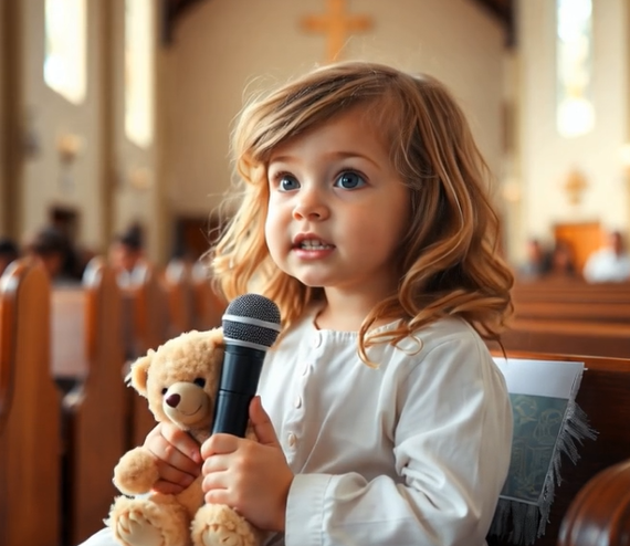 A little girl—no older than four—stood on the cushioned seat of a pew, dressed in a simple white gown, her curls catching the sun. In one hand, she clutched a worn-out teddy bear. In the other, a microphone almost too big for her fingers.
